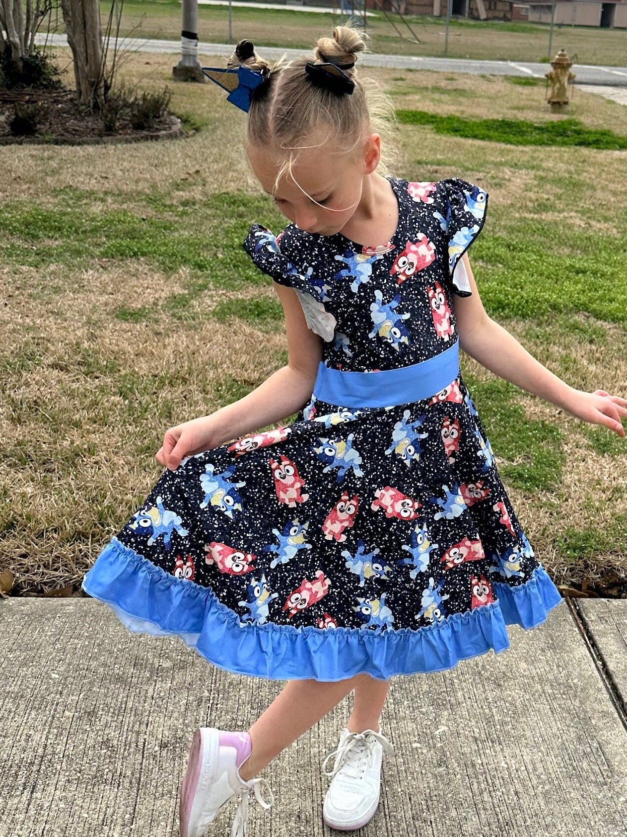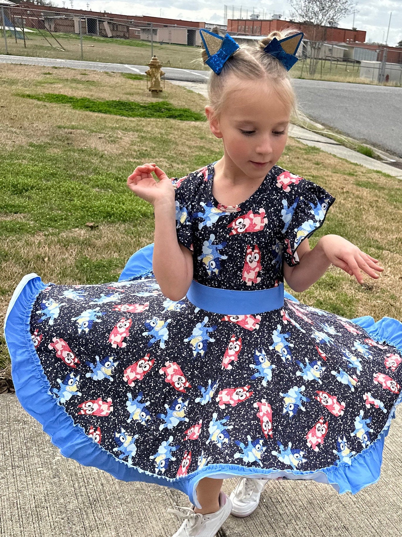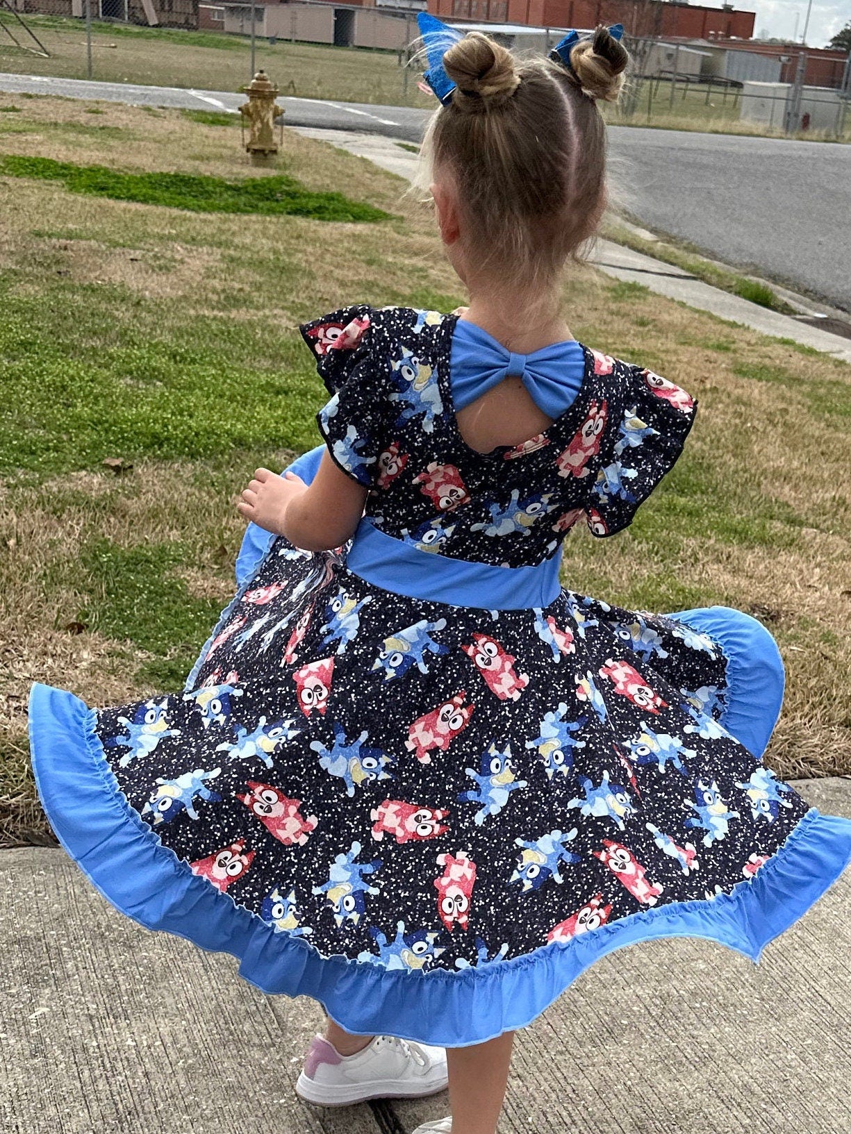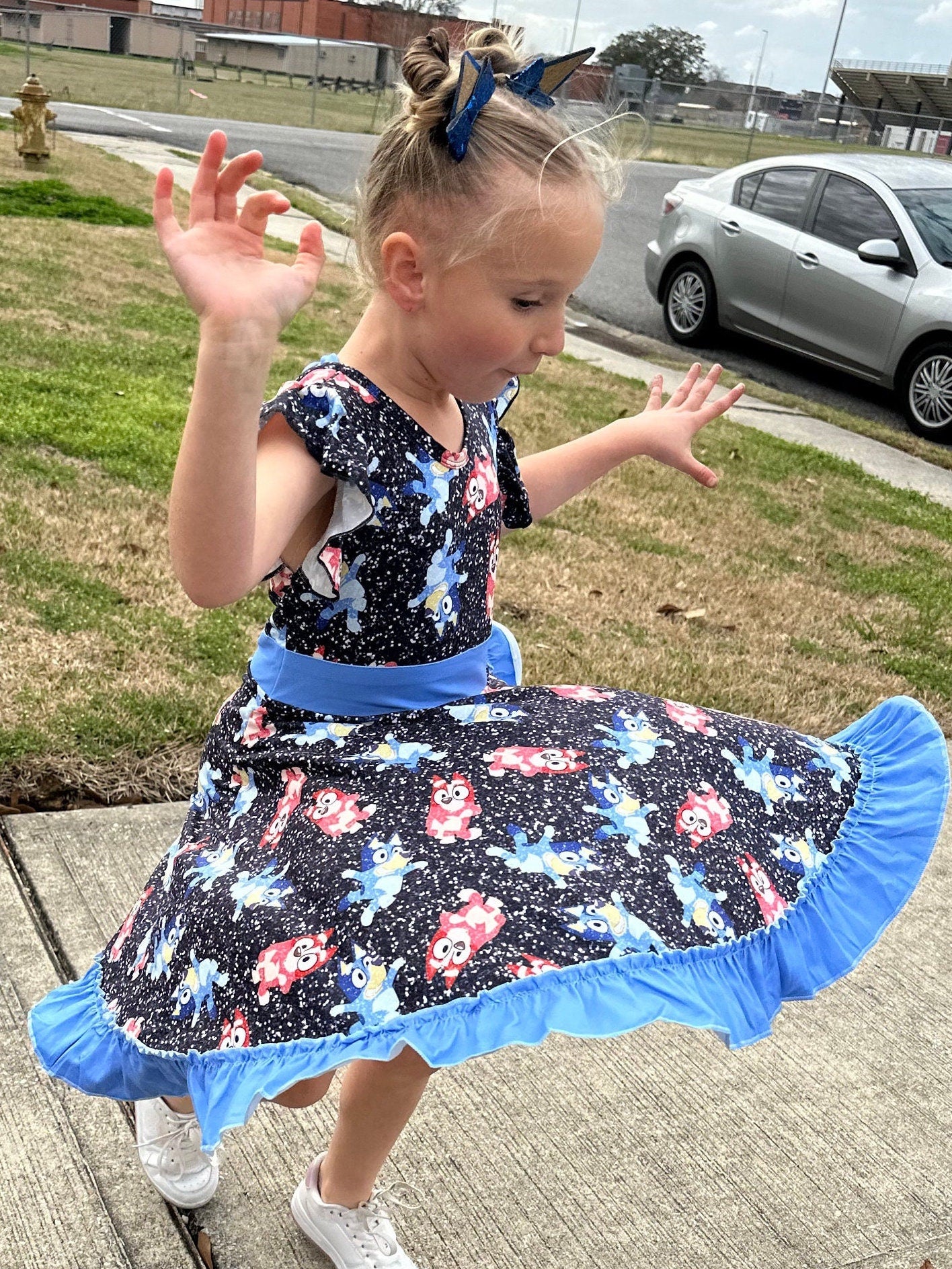 Bluey and Bingo in an almost space sparkly type background. Flutter sleeve, bow back is school appropriate but so fun, huge twirl, soft and stretchy material.