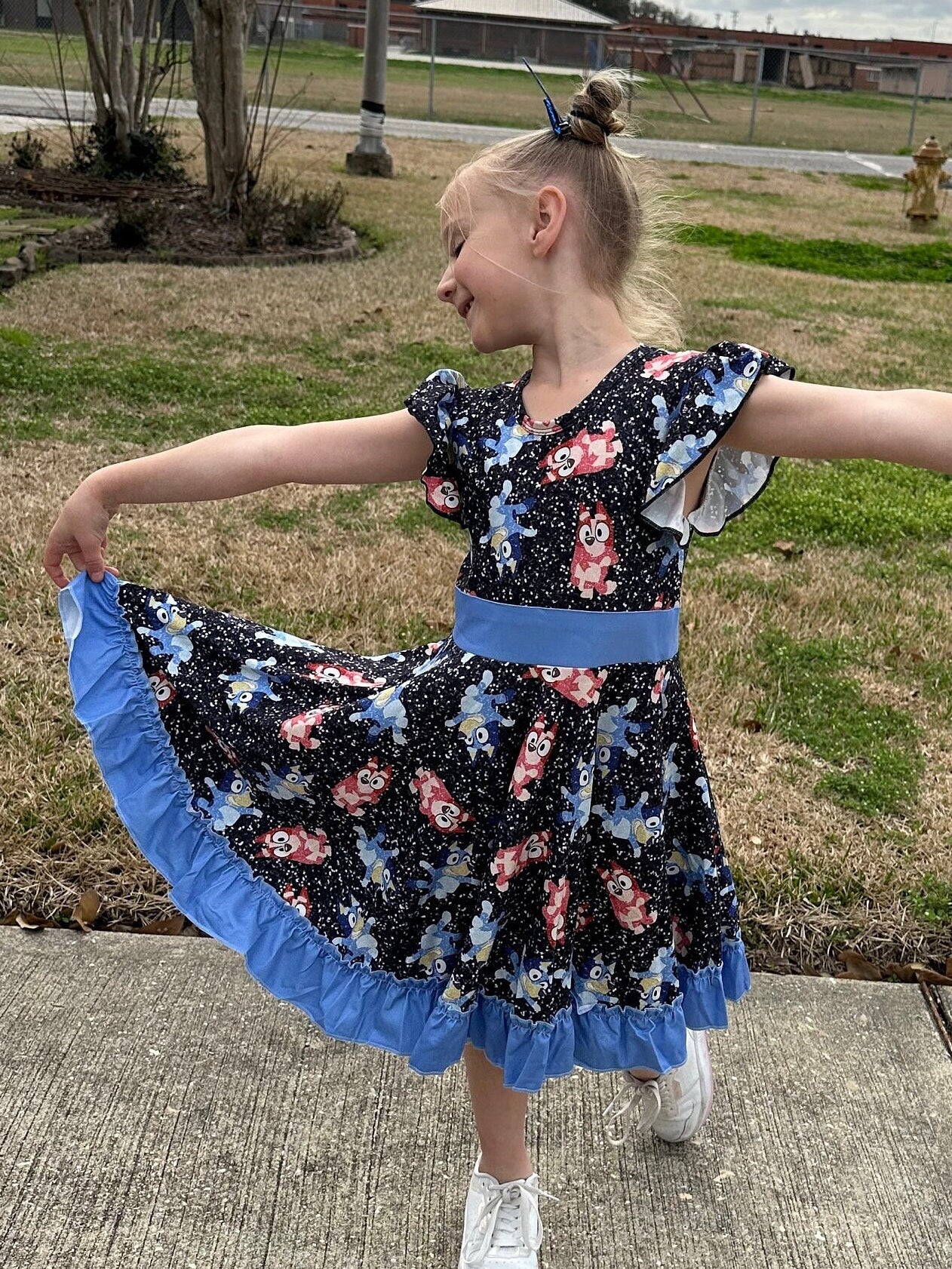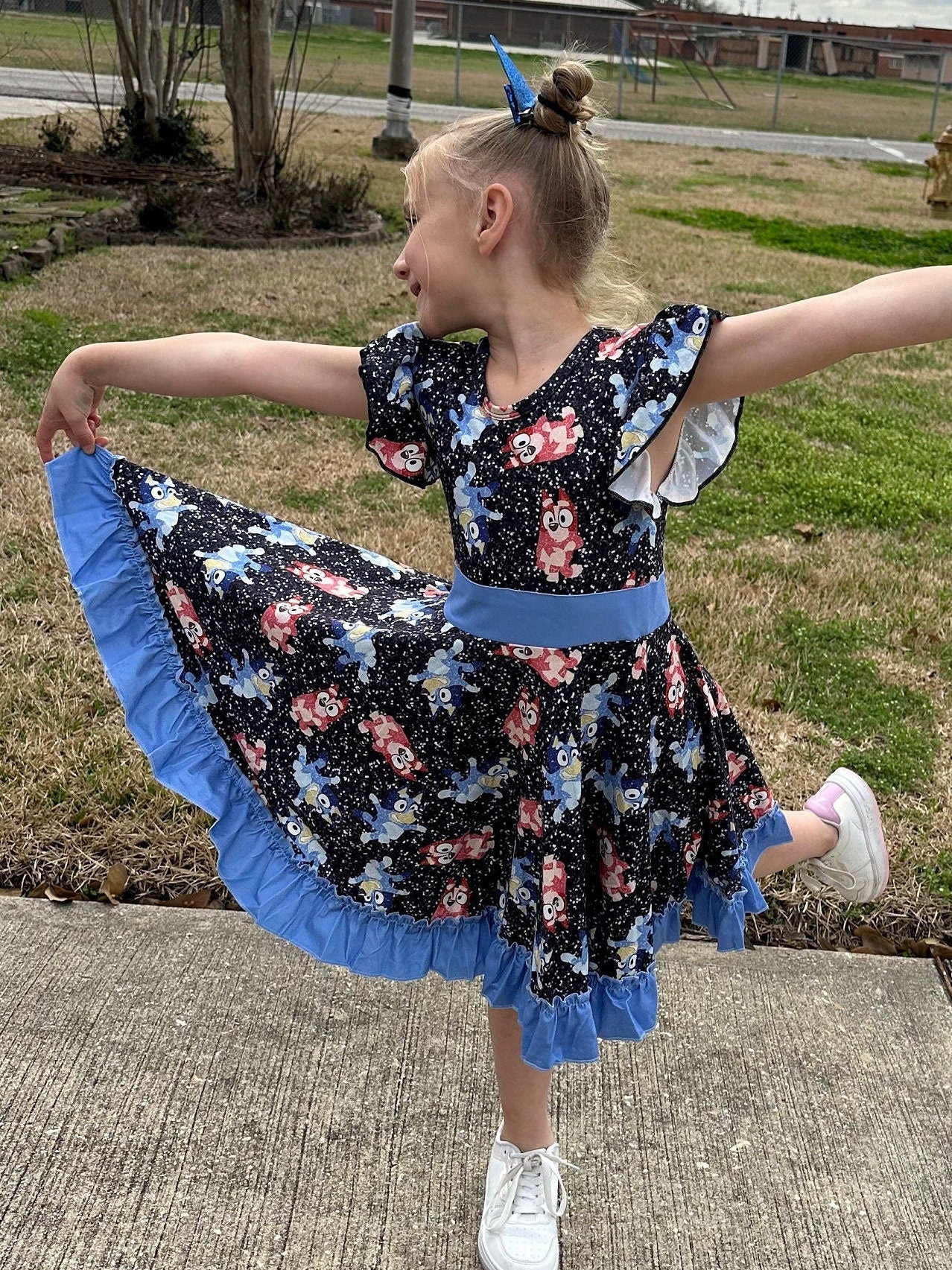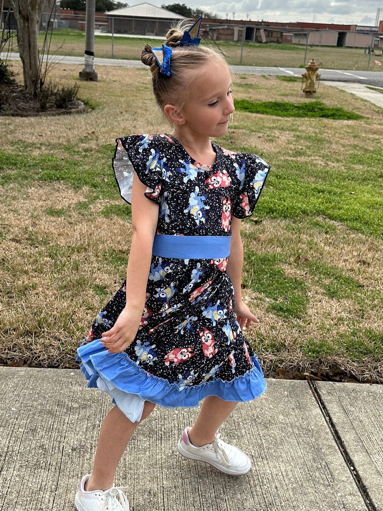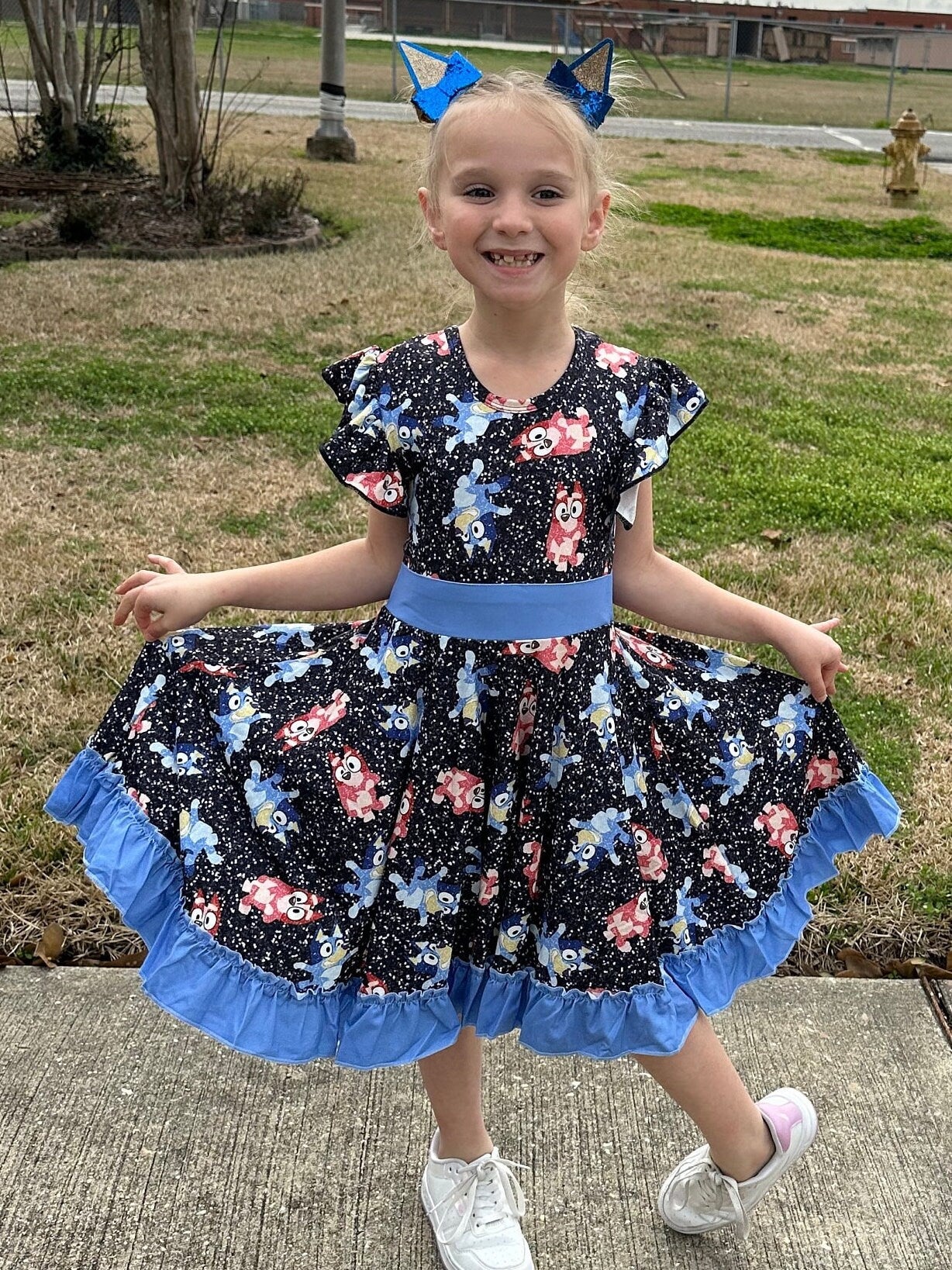 Bluey and Bingo in an almost space sparkly type background. Flutter sleeve, bow back is school appropriate but so fun, huge twirl, soft and stretchy material.