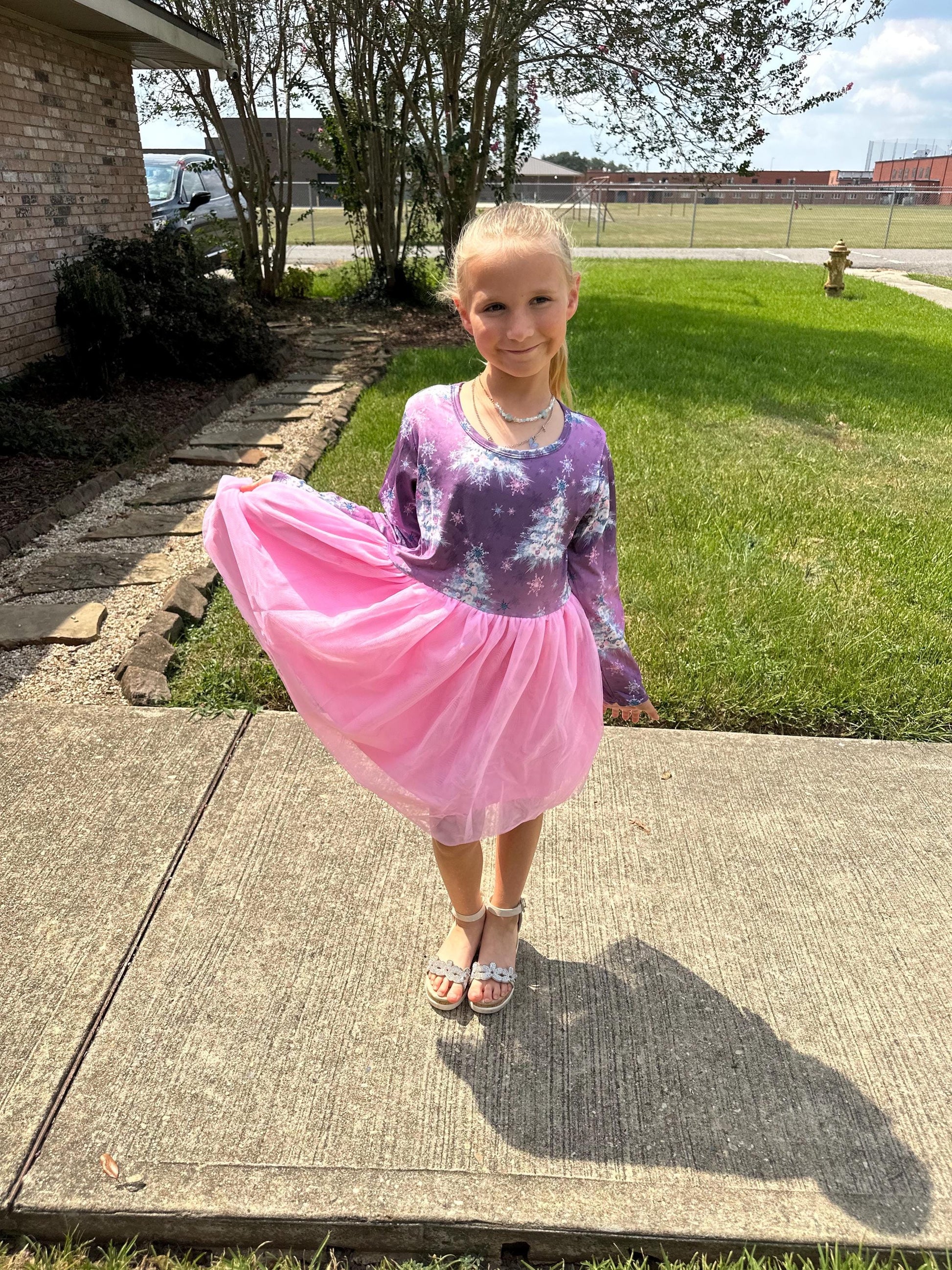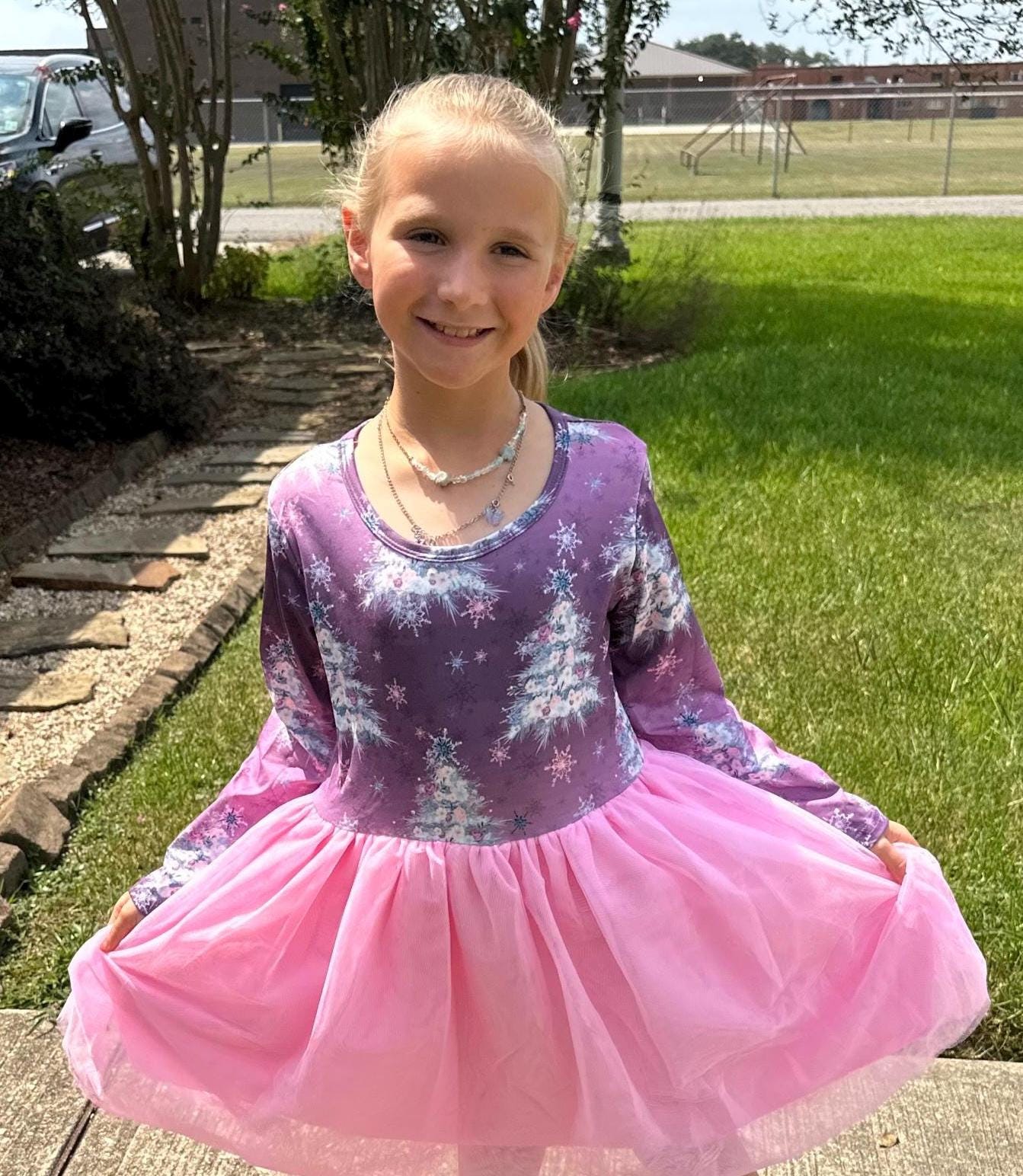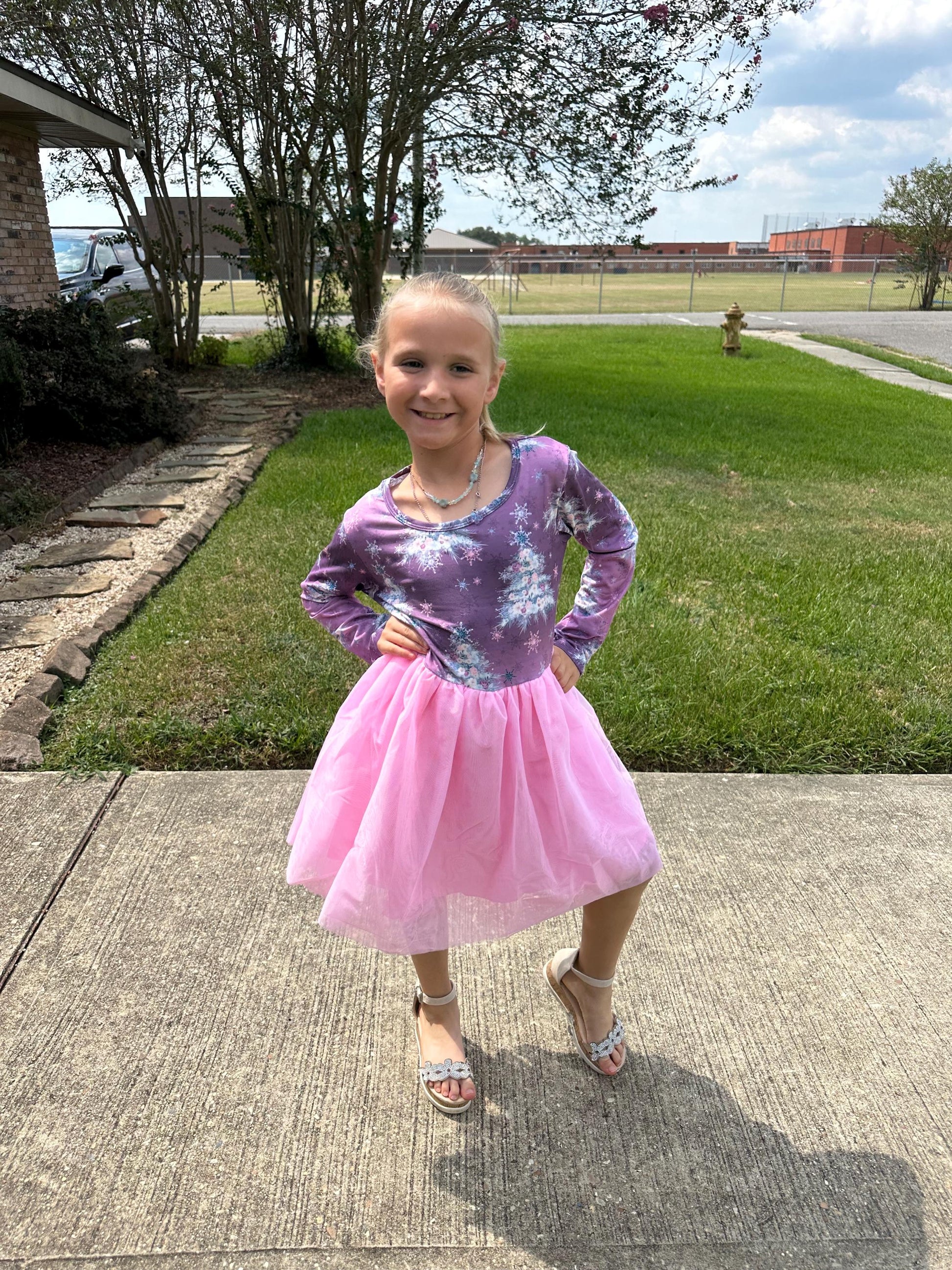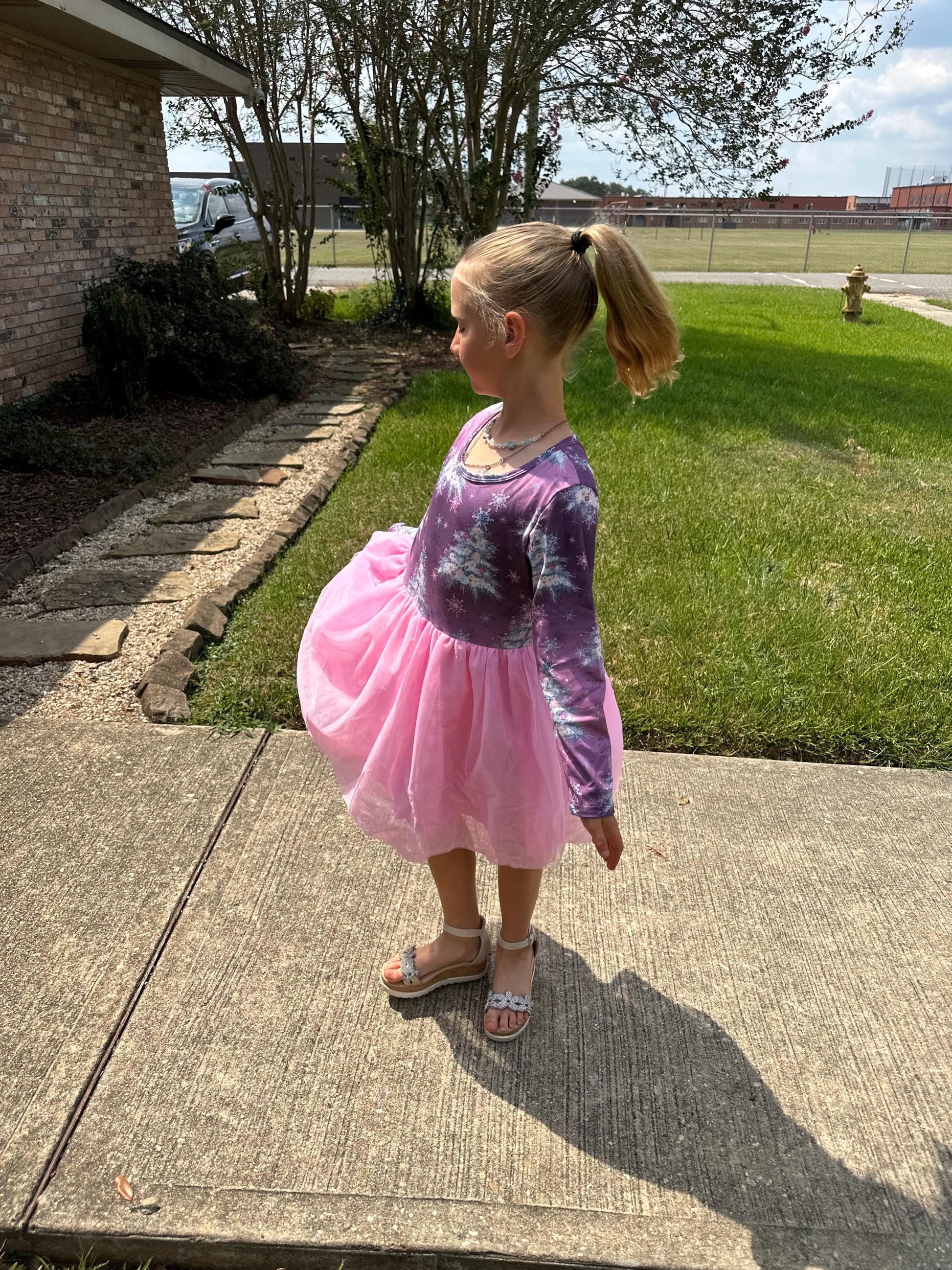 Long sleeves, bodice is 95 cotton 5 spandex. Bottom has tulle with a soft lining. Moderate twirl.