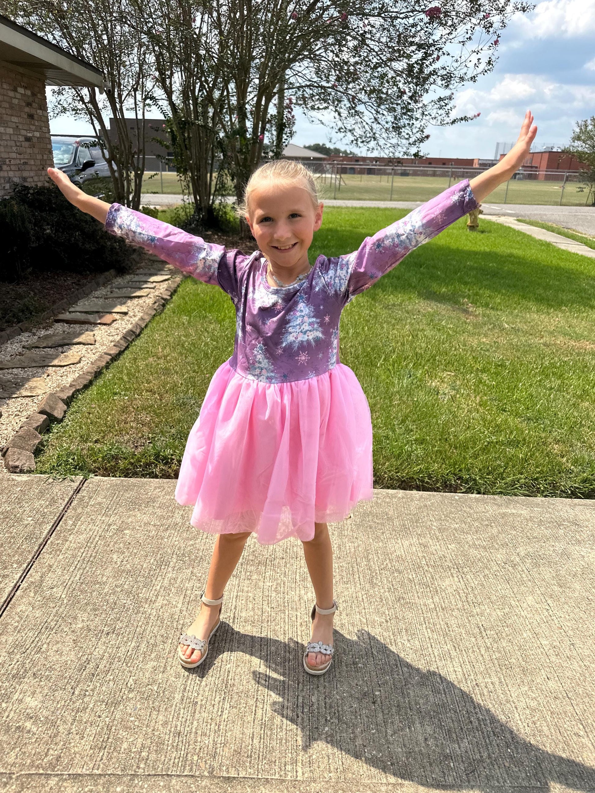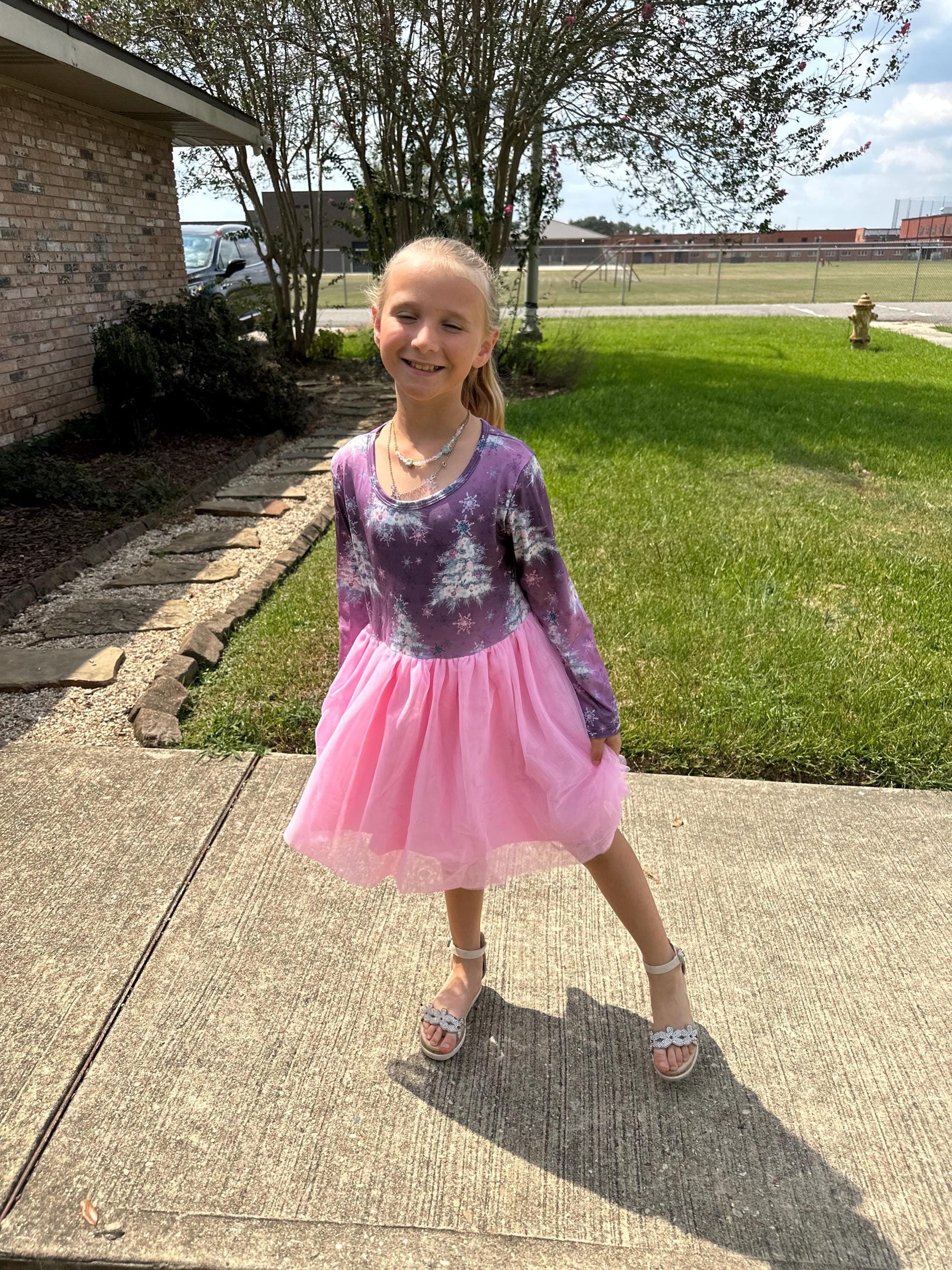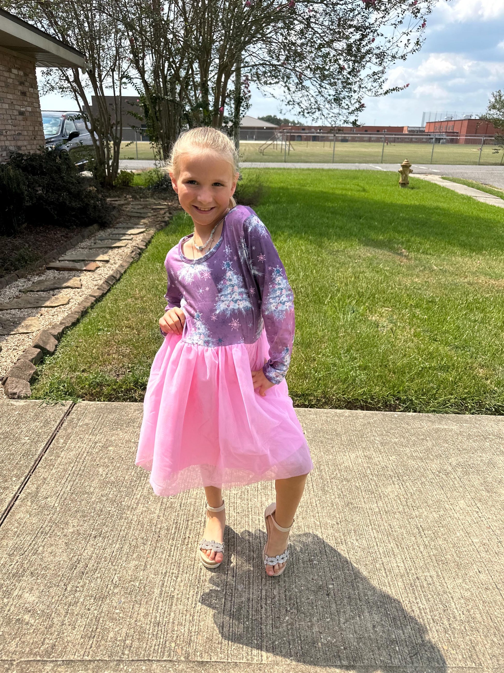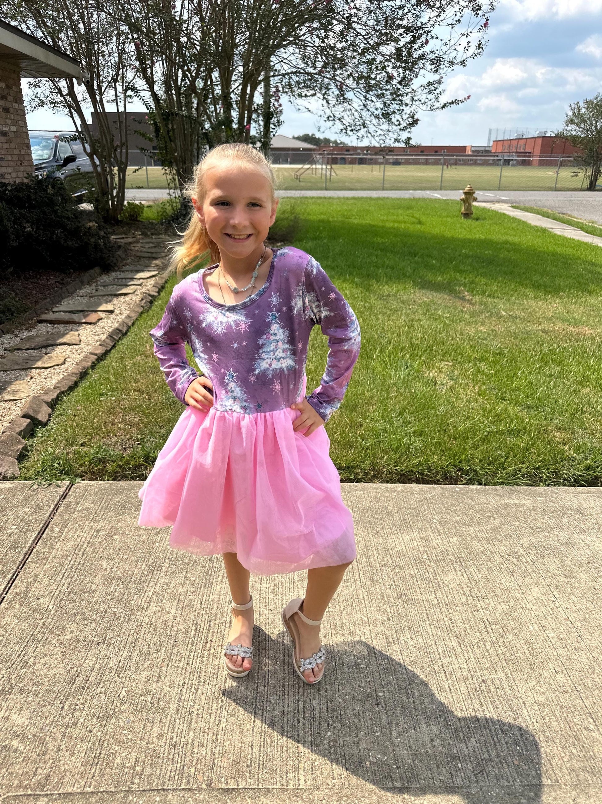 Long sleeves, bodice is 95 cotton 5 spandex. Bottom has tulle with a soft lining. Moderate twirl.