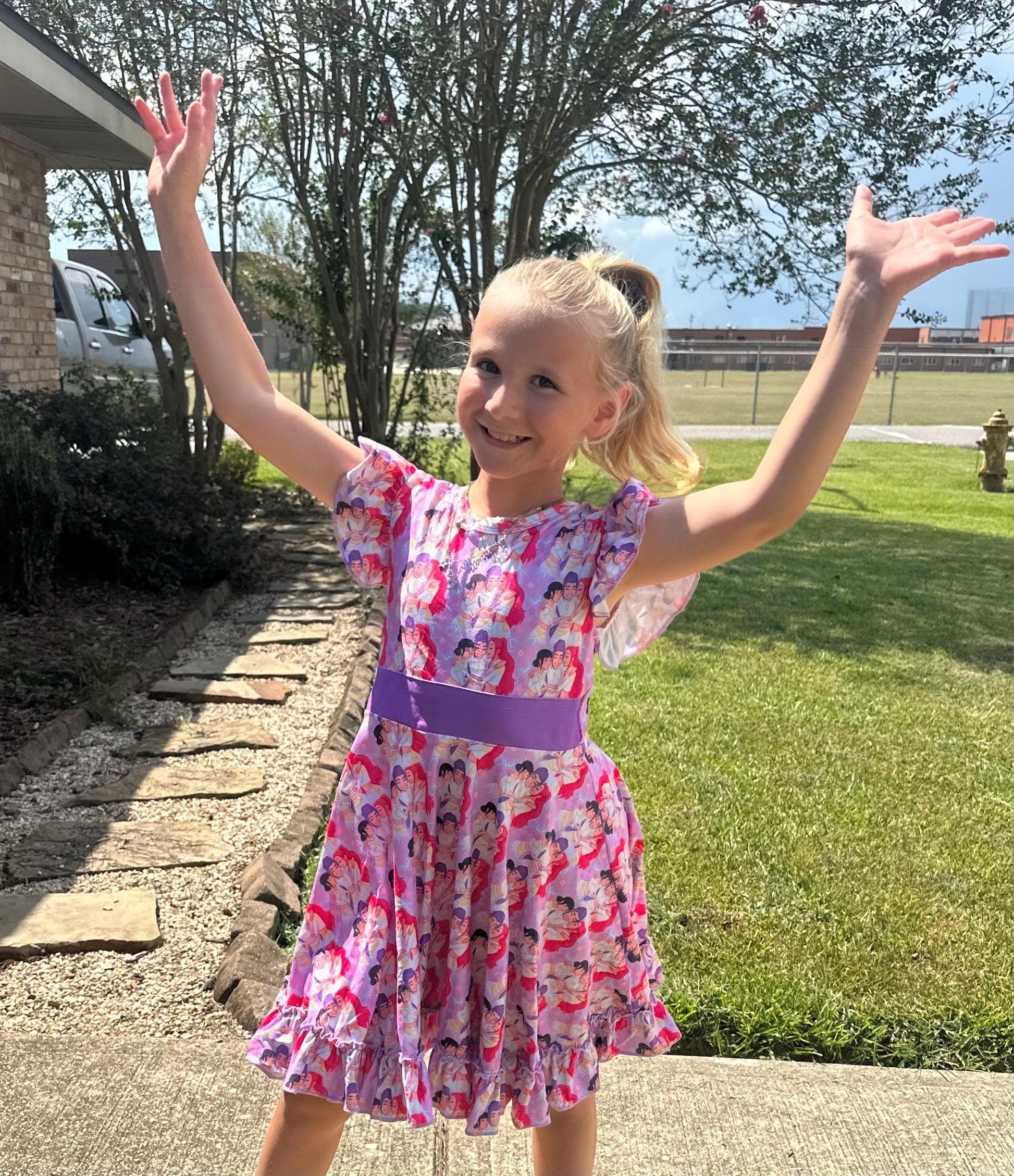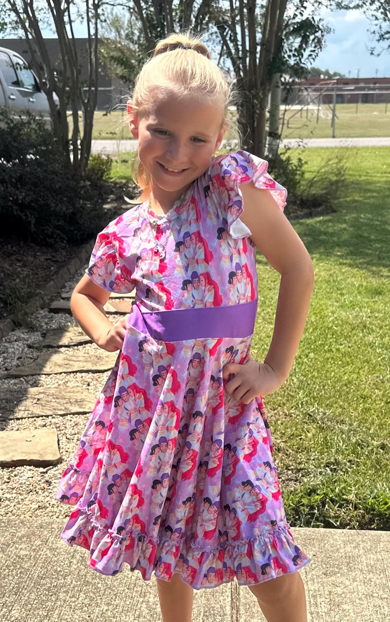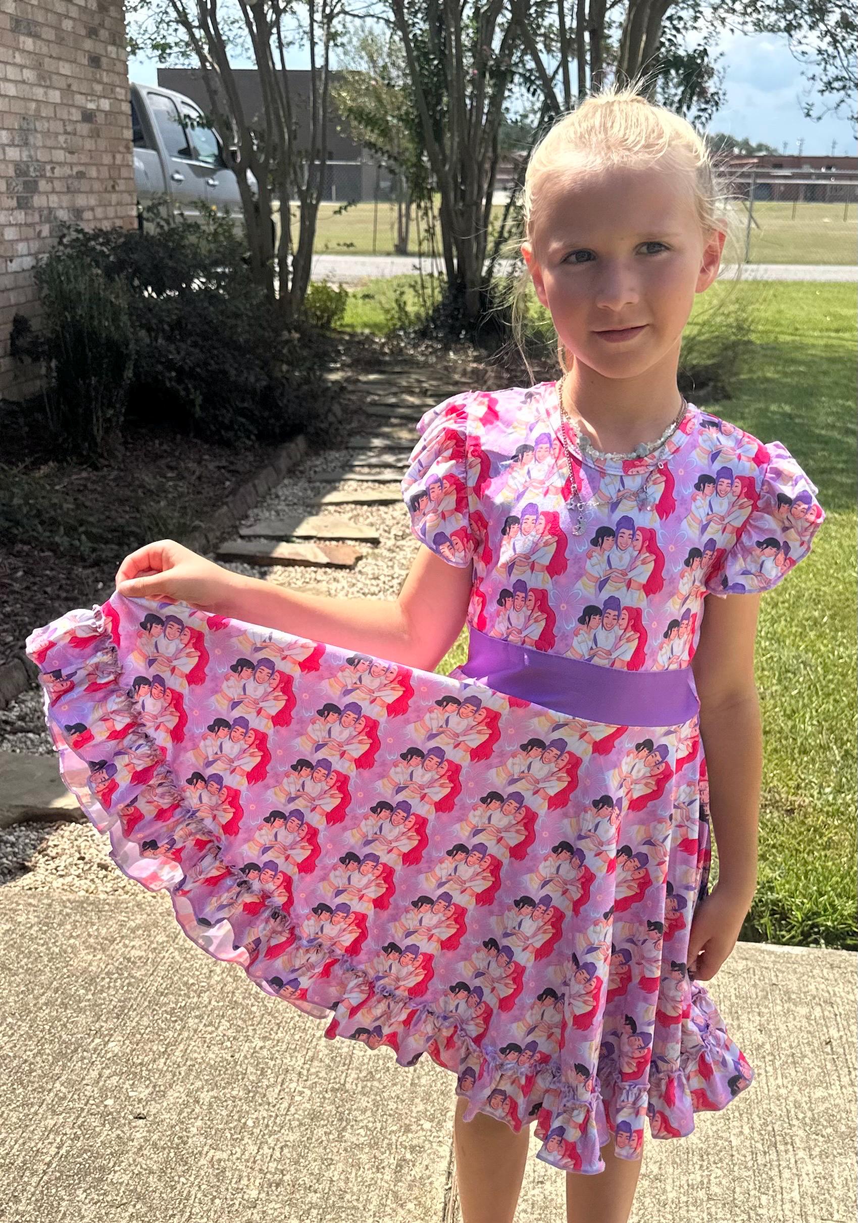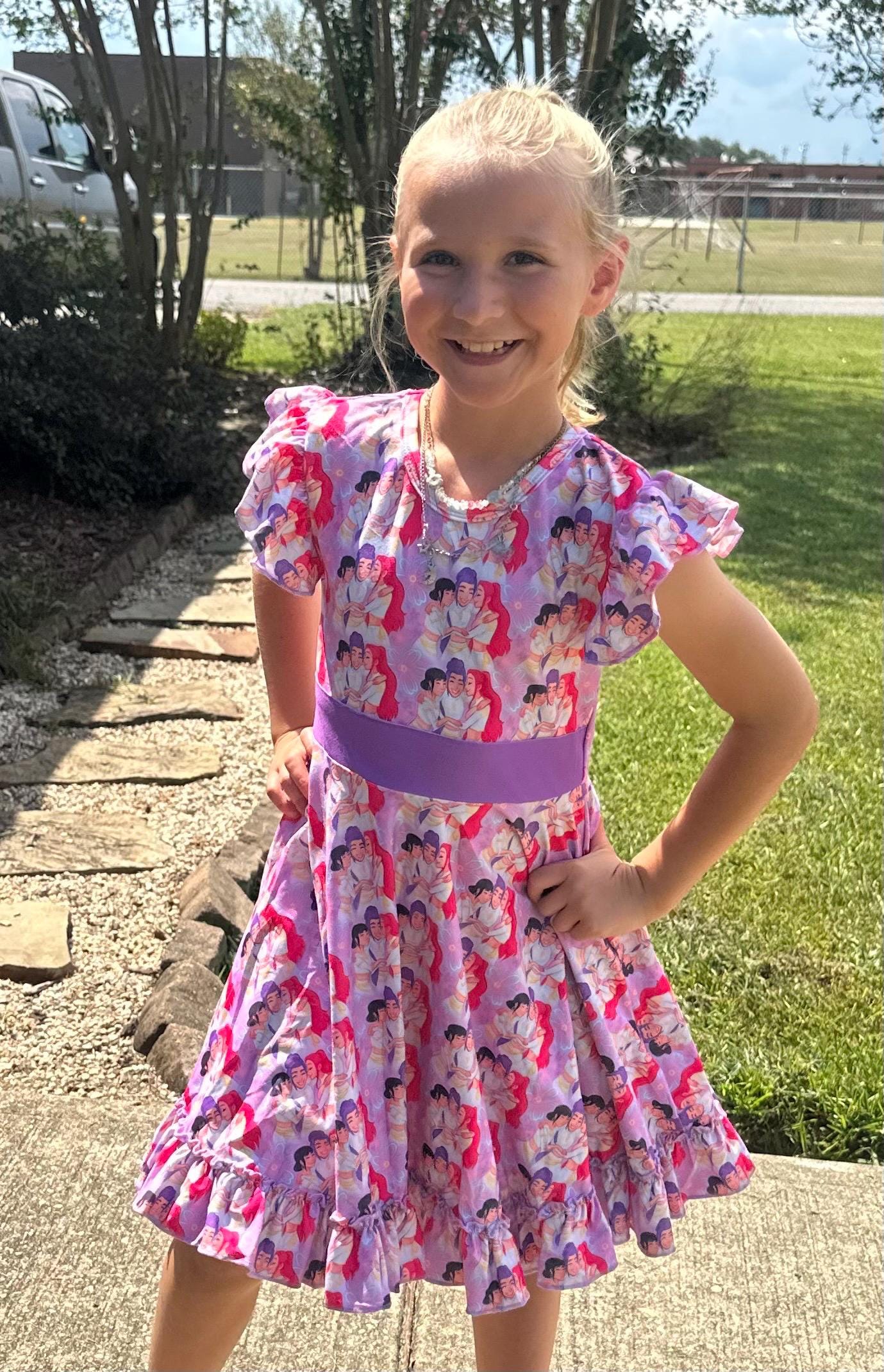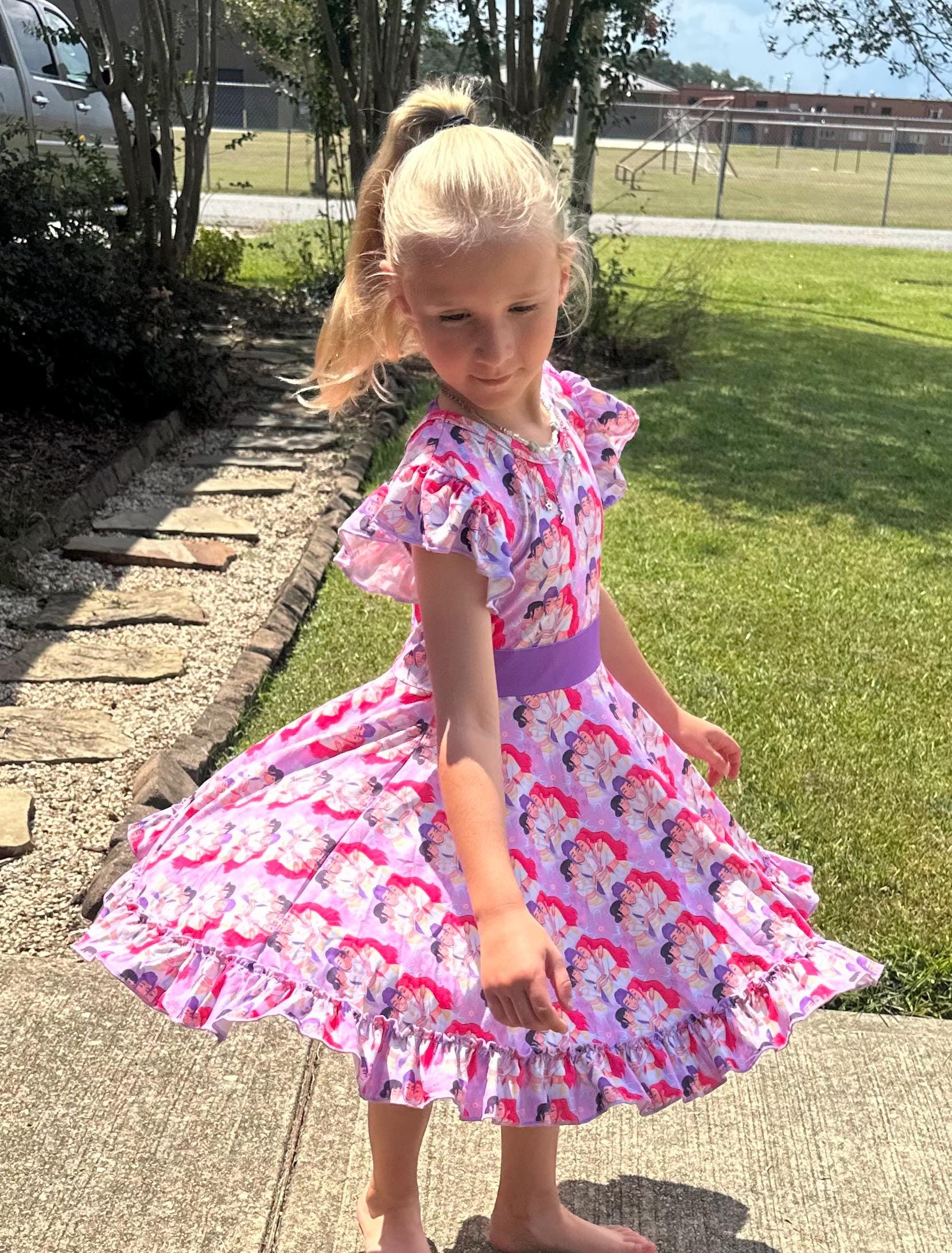 Features: bow back which is school approved, flutter sleeves, huge twirl, soft and stretchy material. sold out sizes will be restocking for the holidays. I can take preorders. just send me a message!