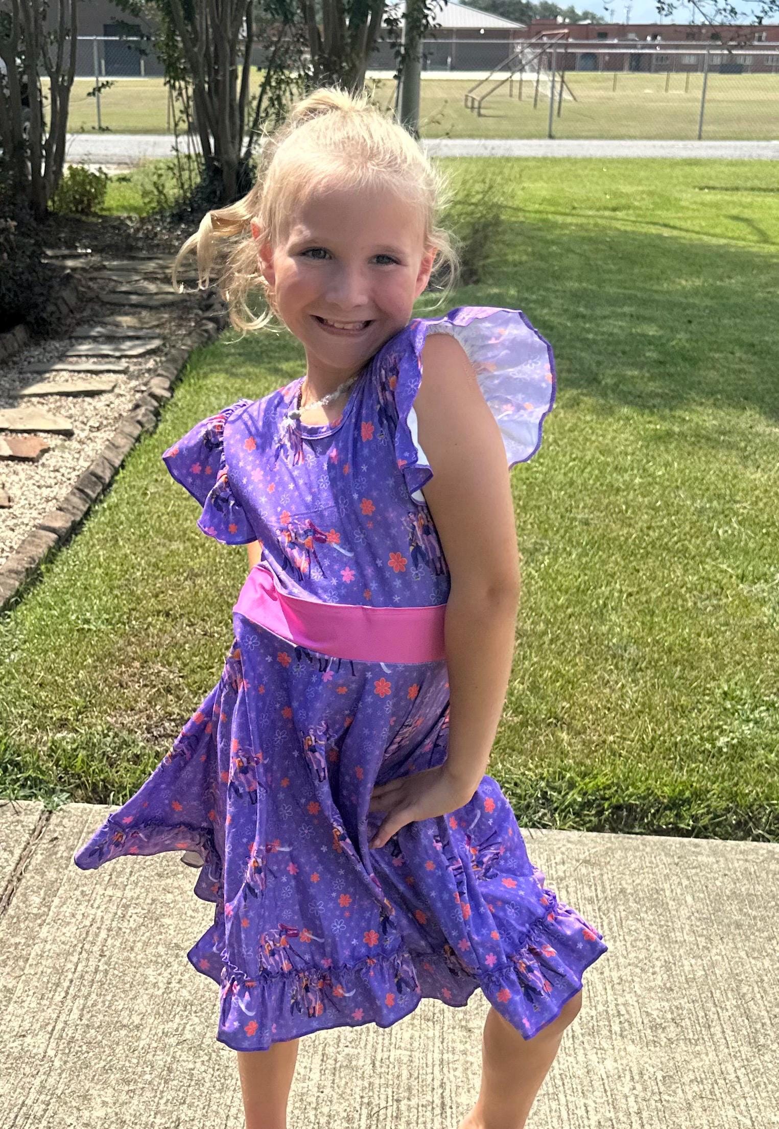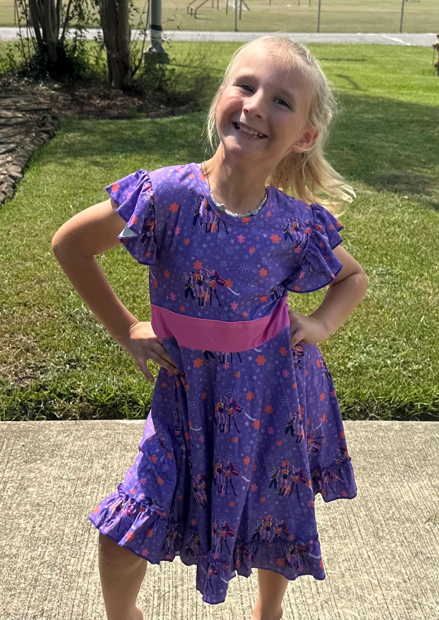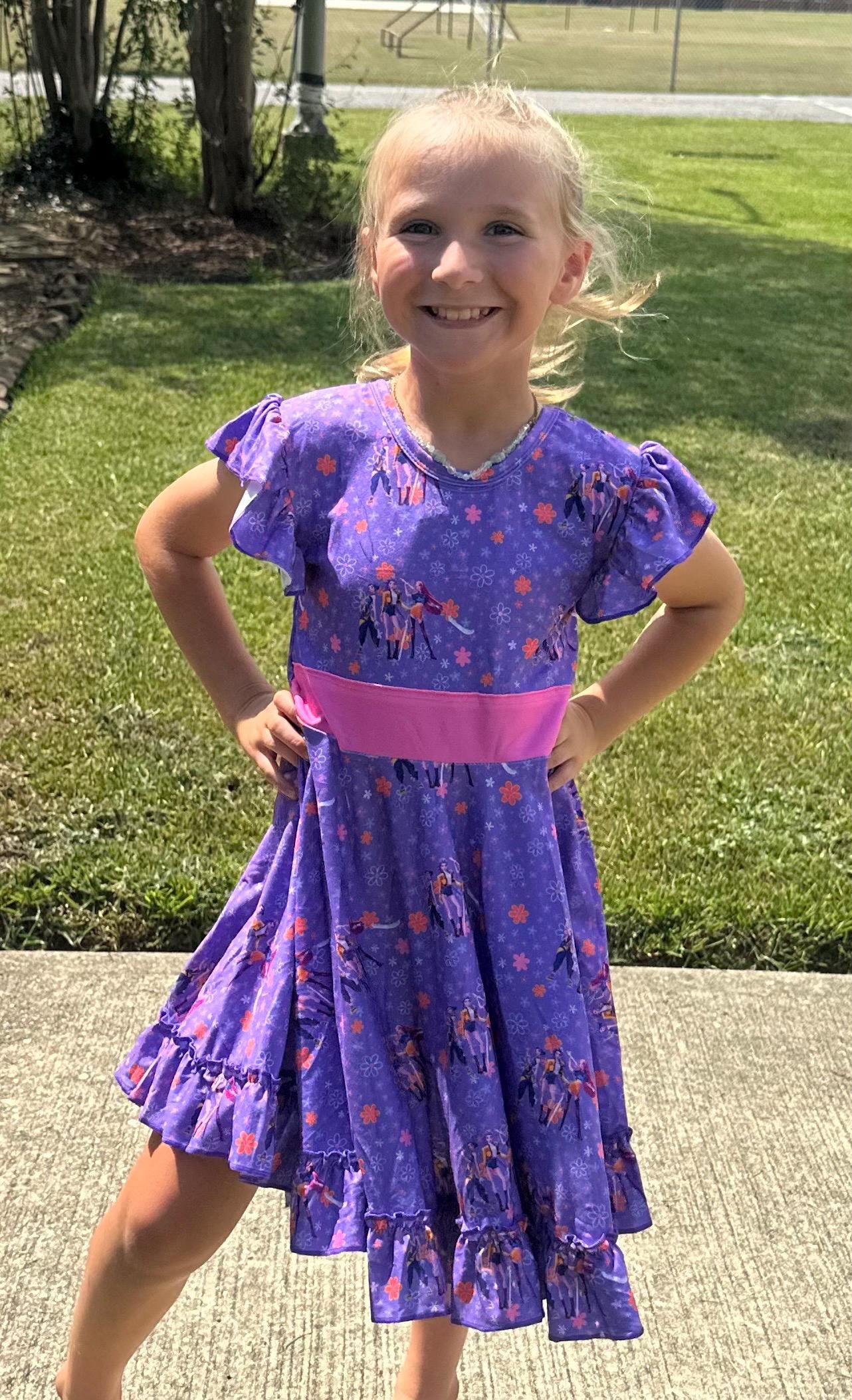 Features: bow back which is school approved, flutter sleeves, huge twirl, soft and stretchy material.