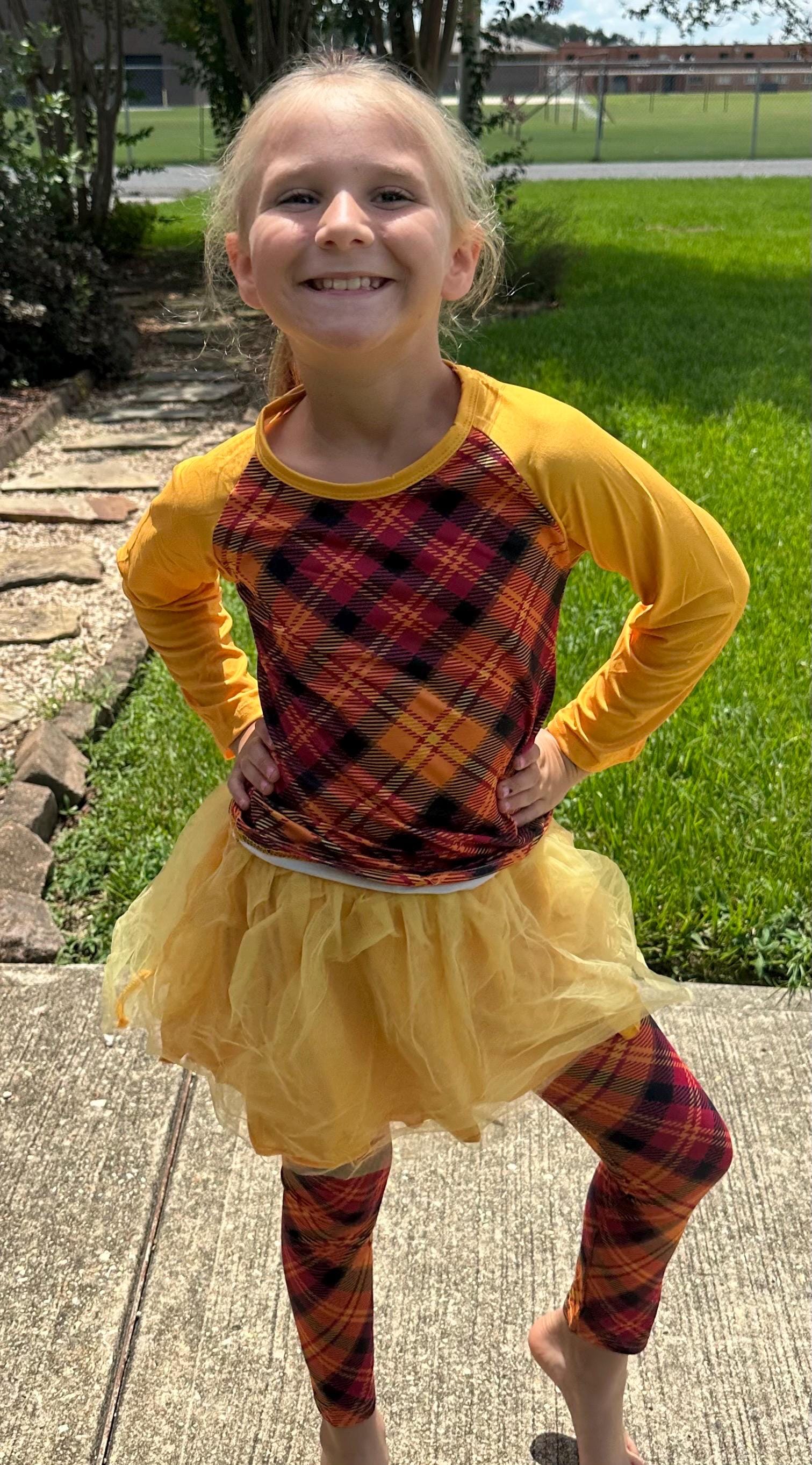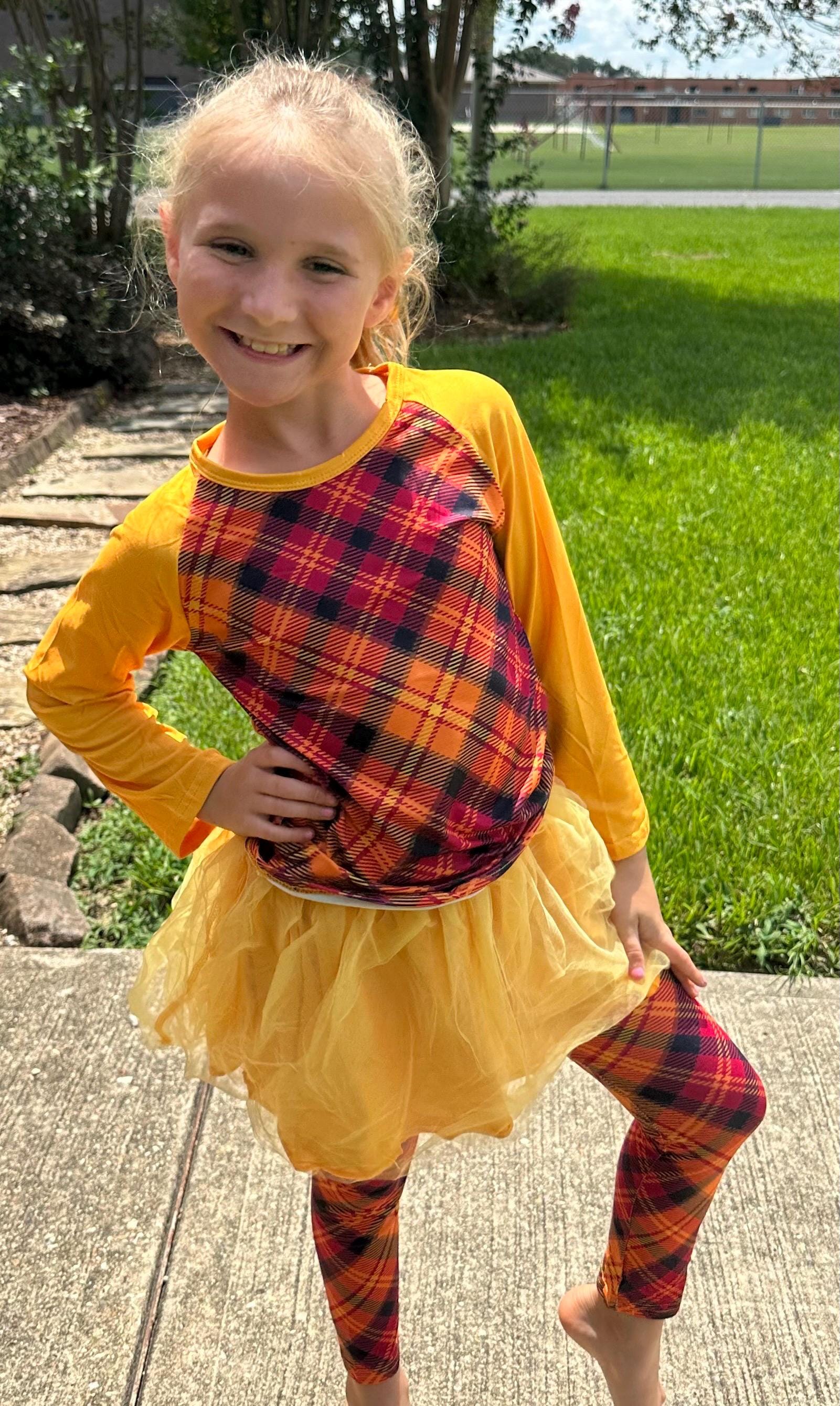 Fall tulle leggings set. Includes long sleeve shirt and tulle skirt leggings. Shirt is long sleeve and soft material. Leggings have a tulle skirt with soft under lay, stretchy waistband and soft material