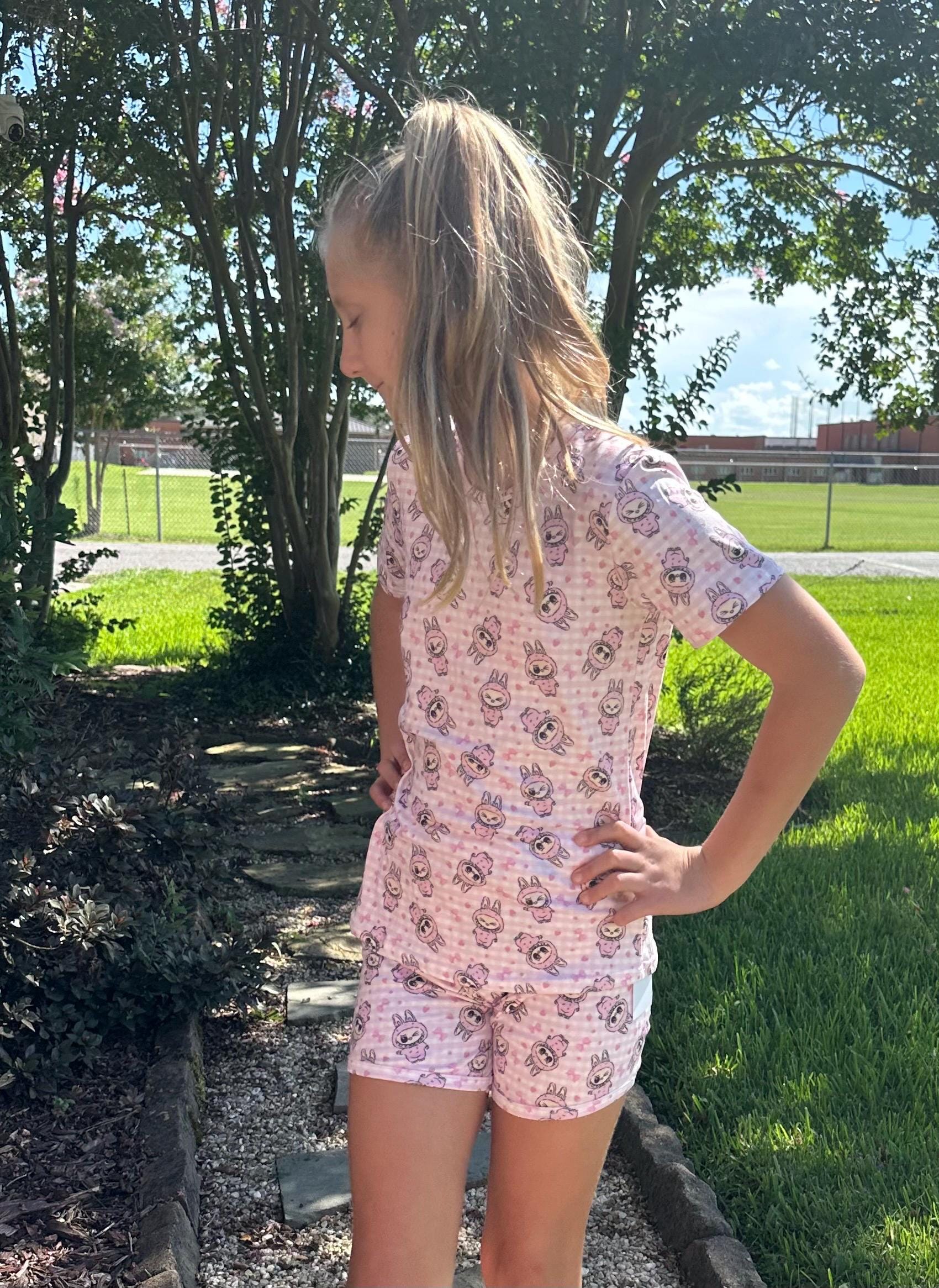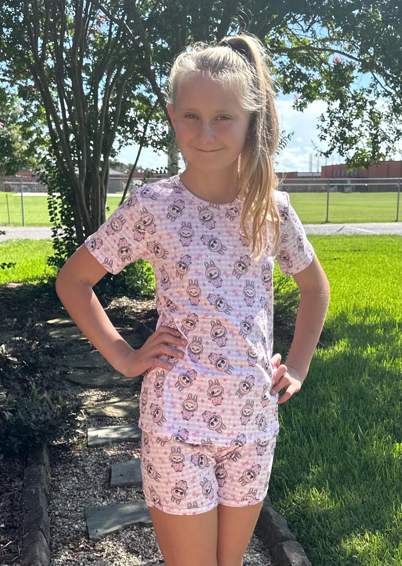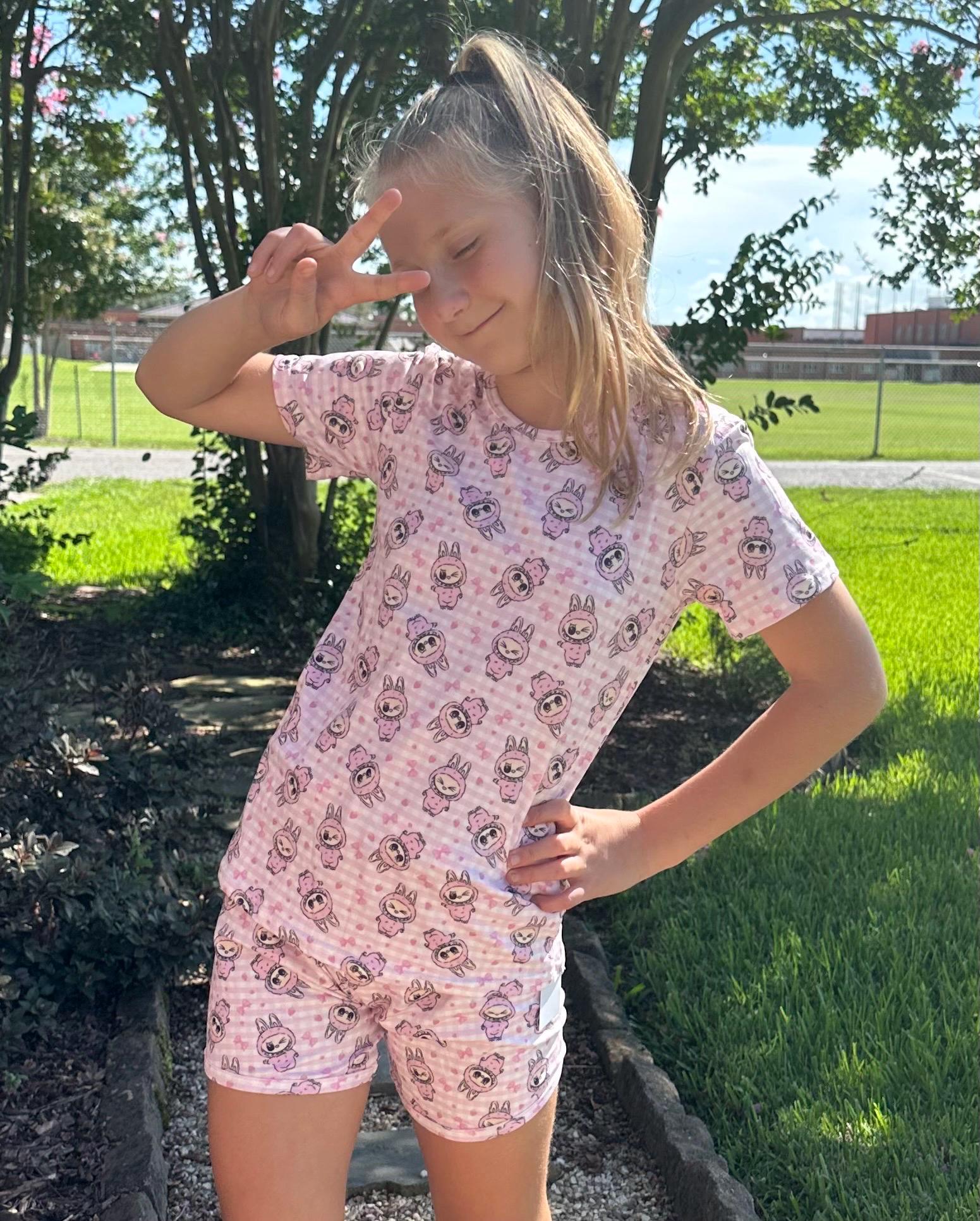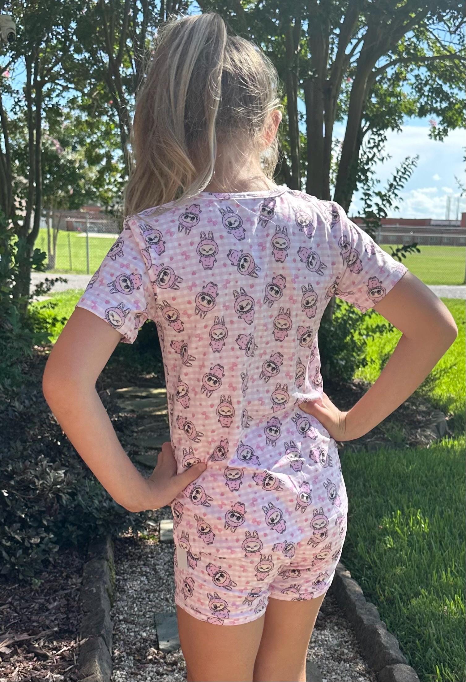 Labubu short set. Set includes t shirt and matching shirts as pictured. Material is soft with a little stretch. Stretchy waistband. When in doubt size up!