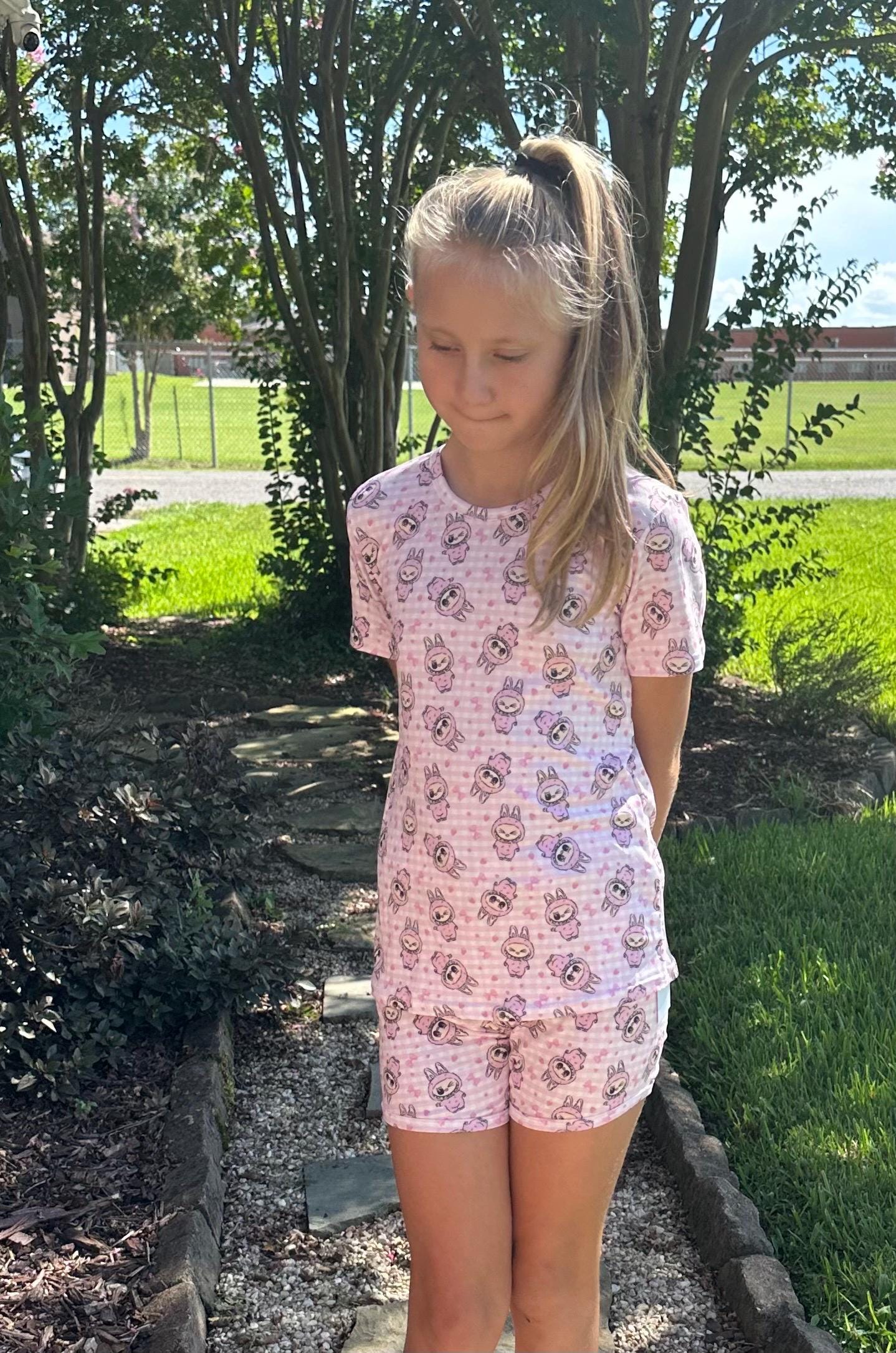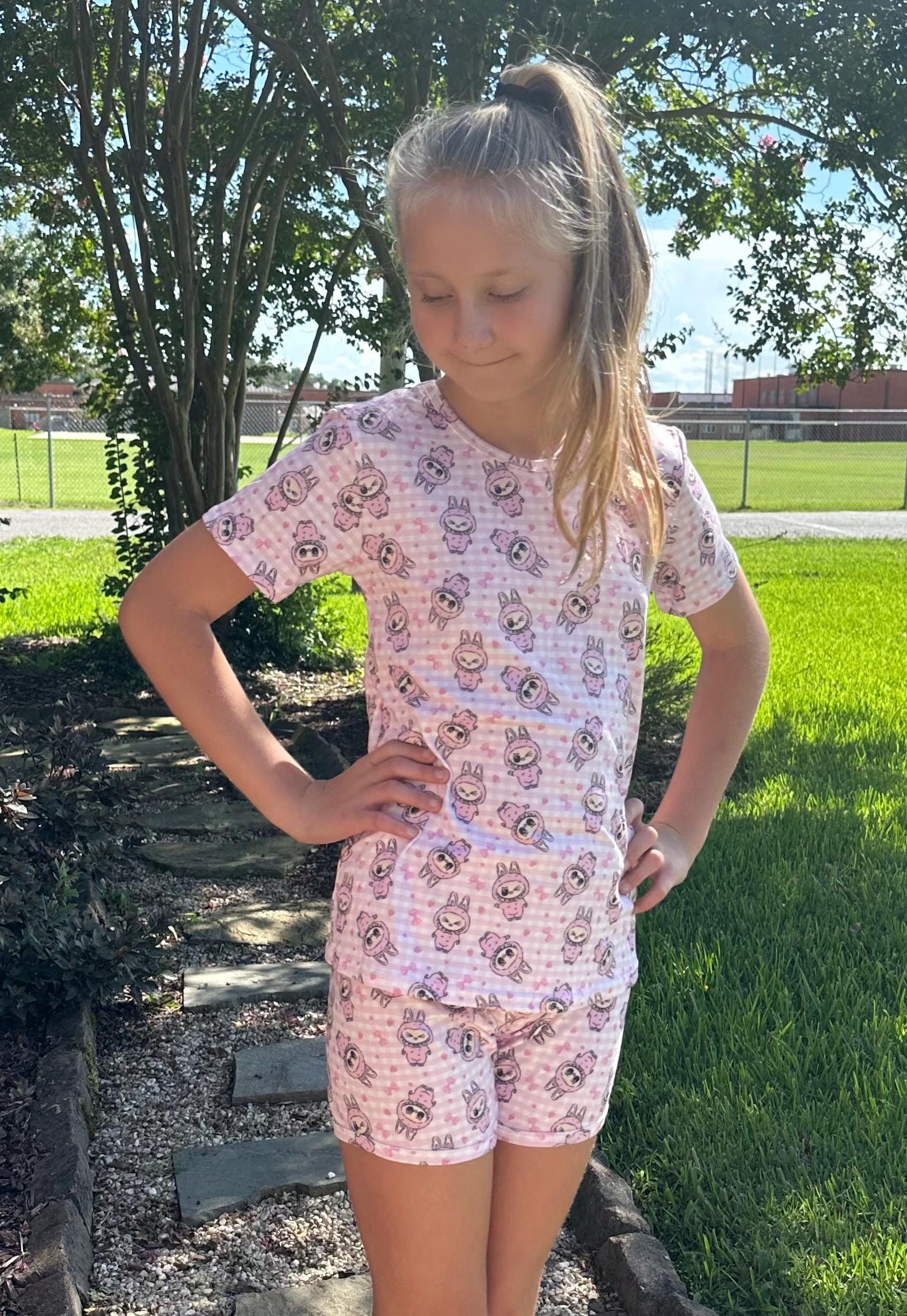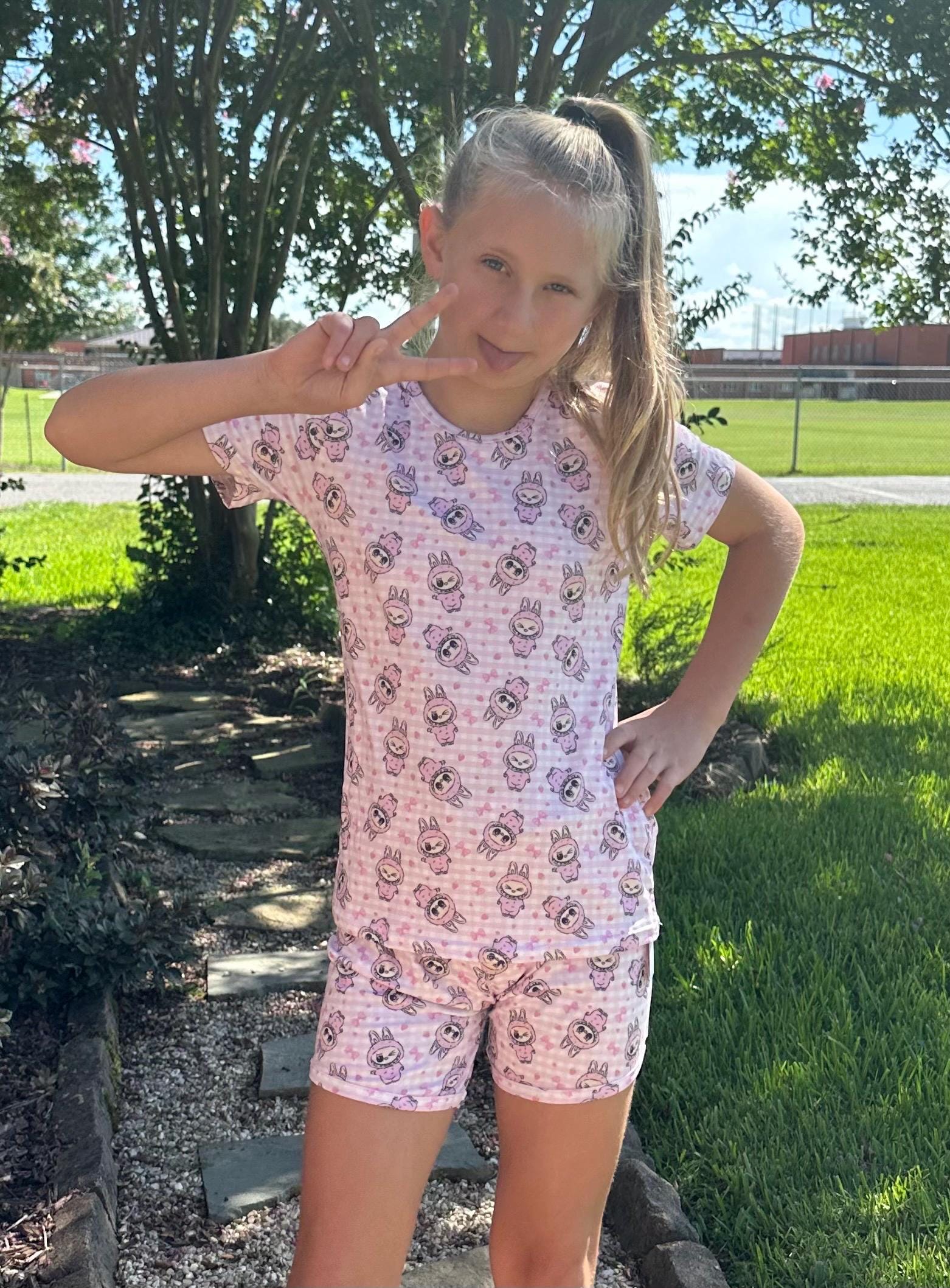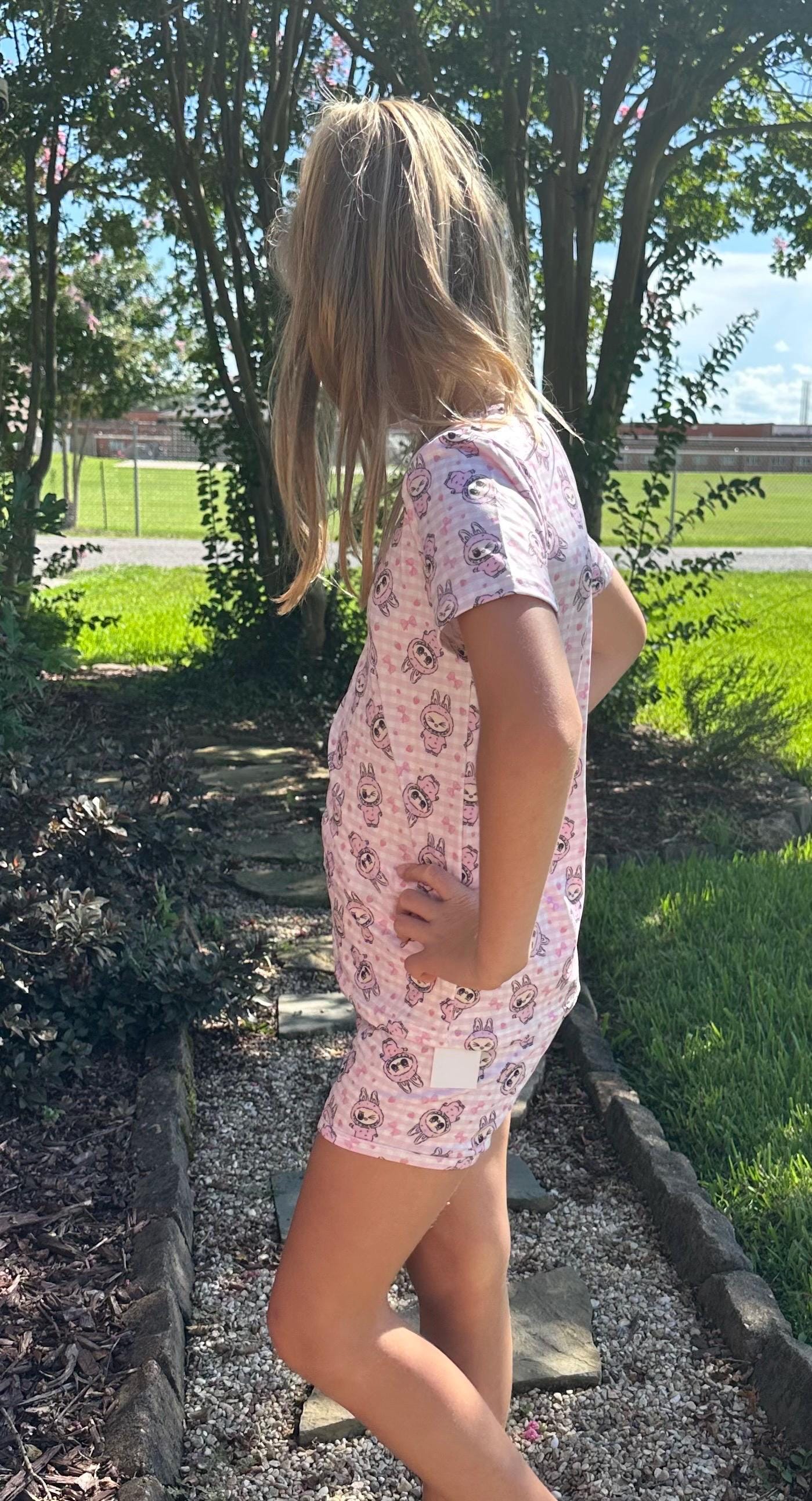 Labubu short set. Set includes t shirt and matching shirts as pictured. Material is soft with a little stretch. Stretchy waistband. When in doubt size up!