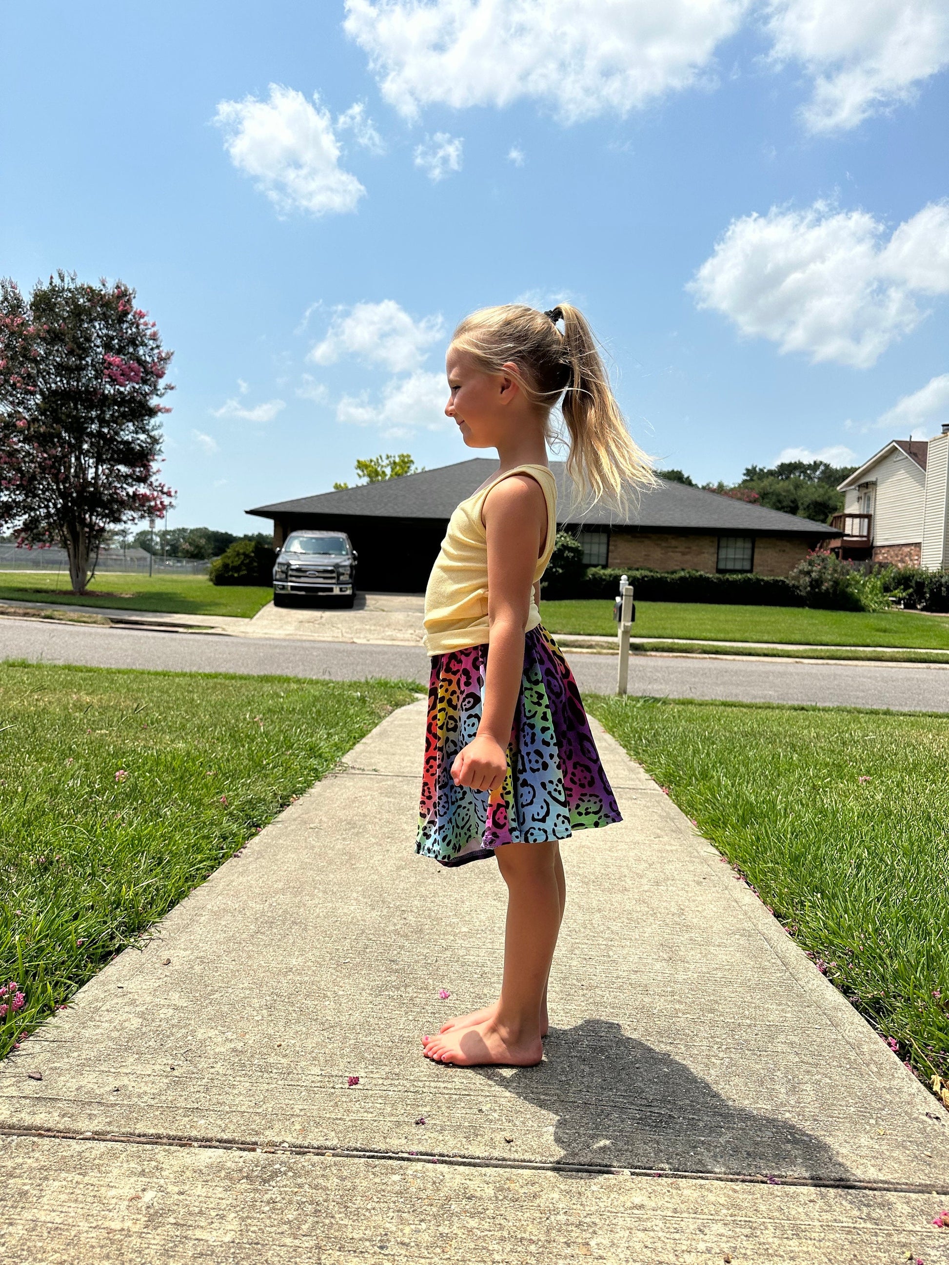 Leopard rainbow twirl skort. Huge twirl, shorts attached to the skirt with a hidden pocket in the shorts, soft stretchy material, yoga style stretchy waistband